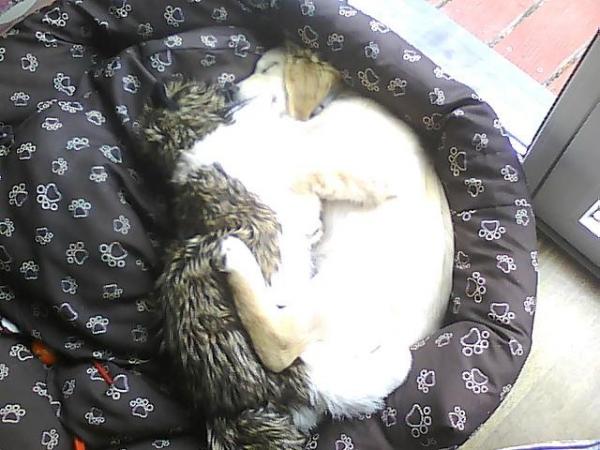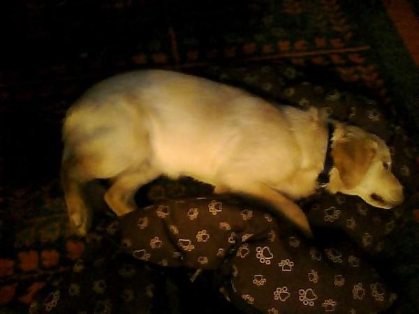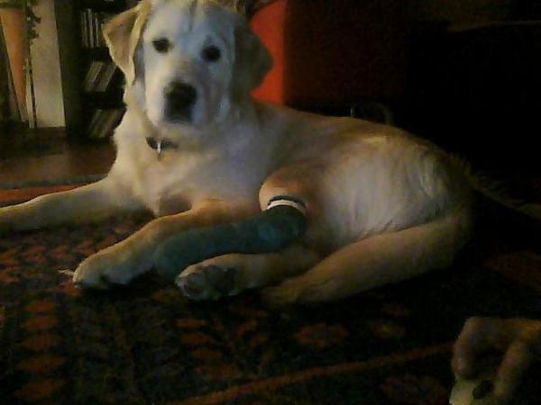 Sam wurde heute von einem großen Schäferhund gebissen obwohl er sich winselnd auf den Rücken legte. Jetzt hat er eine gebrochene Zehe und hat 8 Wochen einen Verband und man muss ihn immer an der Leine haben.